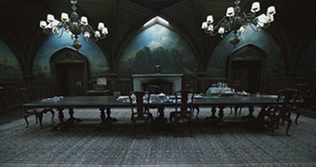 Человек сопроводил профессора в огромный зал с камином, освещенный лишь свечами, и усадил за длинный сервированный стол.