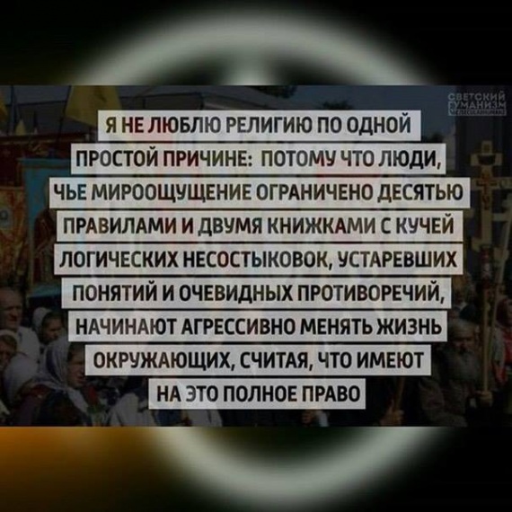 Фигня — это всё, конечно, конфессионная, но ведь никуда паства не исчезает. Засраны мозги у людей. А это прямое управление скотобазой сверху. Никто же не даст команду – Фсё! Конец религиям. Через 100 лет никто и не вспомнит о боге. Нет же, людям вдалбливают и вдалбливают религиозные догмы. Значит, это кому-то надо.