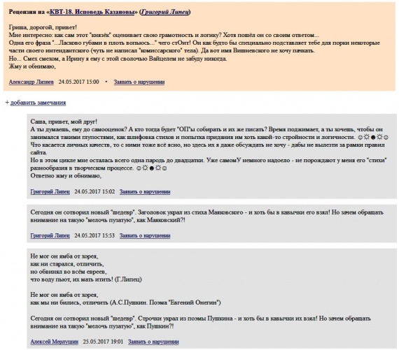 Он называет меня чмом и антисемитом, хотя я вообще ничего против евреев не писал! Я указал ему на то, что он украл у Пушкина его строчки из поэмы.