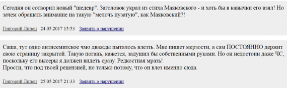 Все, у кого липцовые каляки-маляки вызывает отторжение, или, даже просто равнодушие, те – по гришкиному мнению – «черносотенцы, антисемиты, непорядочные, ублюдки, глупцы, провокаторы, завистники, лжецы, шестерки и подстилки Юши Могилкина».