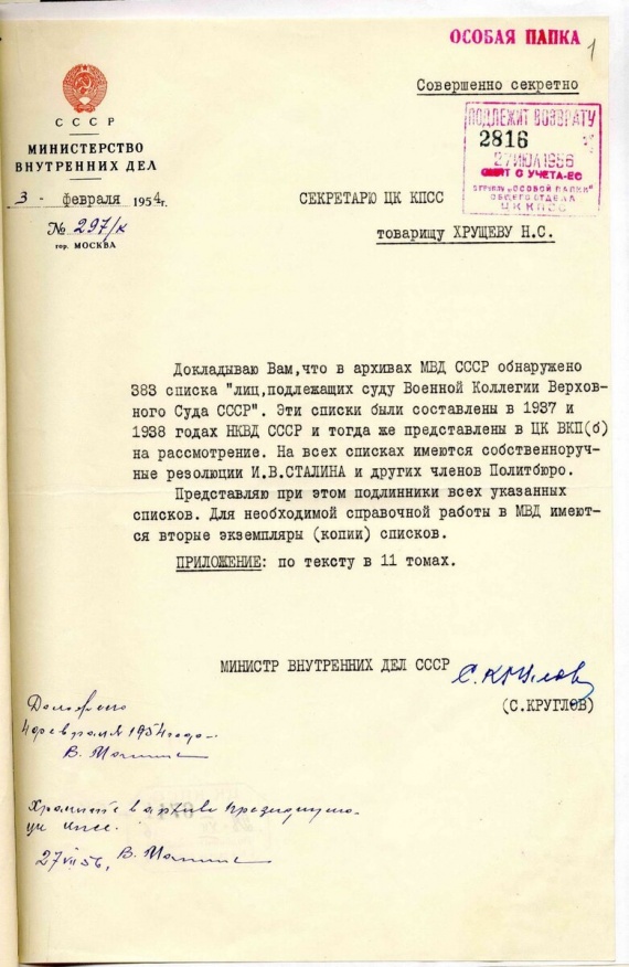 «В архивах МВД СССР обнаружено 383 списка «лиц, подлежащих суду Военной коллегии Верховного Суда СССР». Эти списки были составлены в 1937 и 1938 годах НКВД СССР и тогда же представлены в ЦК ВКП(б) на рассмотрение».