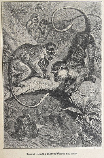 У Альфреда Брэма в его «Жизнь животных» описана некая «Зеленая обезьяна, синегубая мартышка (Сеrcopithecus sabaebus):