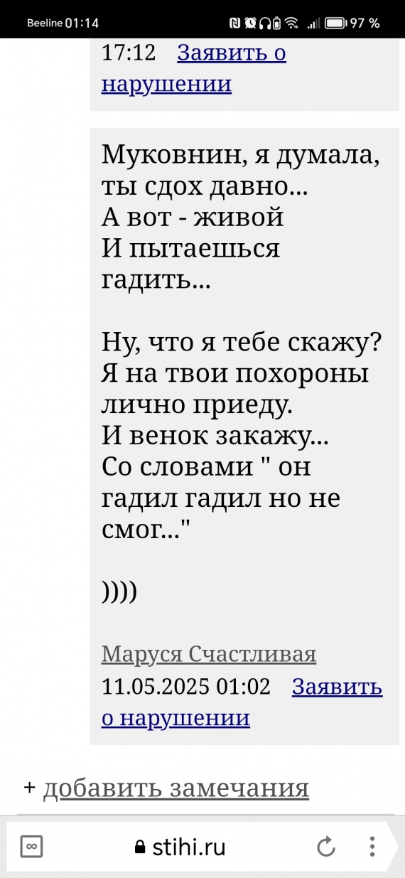 Боялся он поэта Z Дмитрия Мальянца, поэтессу Z Марусю Счастливую, и далее по списку, встревал в переписку, вонял, заручившись поддержкой одменистрацыи с-ру, в общем всячески отмечался, говнюк.