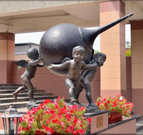 Гигантскую Клизму длиной более метра поддерживают три бронзовых ангелочка, видать, светлые образы правнуков оригинала.