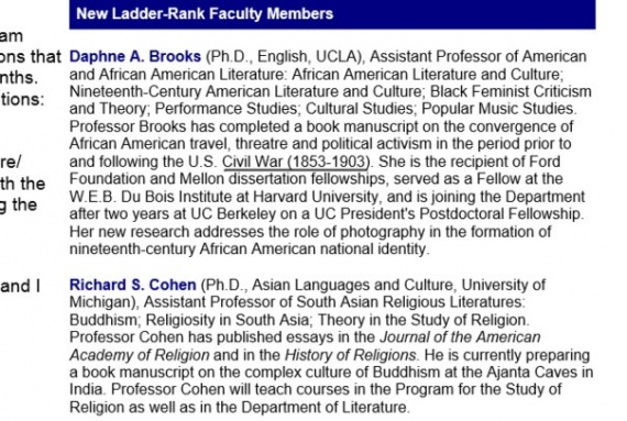 Дафна а. Брукс (Ph. D., английский, UCLA), доцент американской и афро-американской литературы: афро-американской литературы и культуры; девятнадцатого века американская Литература и Культура; черный Феминистской критики и теории; выполнение исследований; Культурология; популярная музыка исследованиях. Профессор Брукс завершил рукопись книги о сходимости African American travel, улицей и политической активности