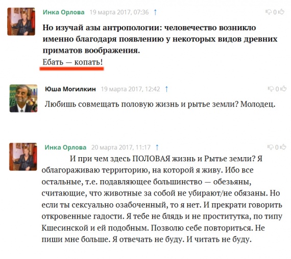 «И при чем здесь ПОЛОВАЯ жизнь и Рытье земли? Я облагораживаю территорию, на которой я живу. Ибо все остальные, т.е. подавляющее большинство — обезьяны, считающие, что животные за собой не убирают/не обязаны. Но если ты сексуально озабоченный, то я нет. И прекрати говорить откровенные гадости. Я тебе не блядь и не проститутка»