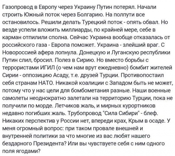 «Путин поднял Россию после её окунания в штатовское дерьмо шпионом Горби и пьяницей Ельцином.Вы прекратите! Мы не слепые и всё видим. Выгнать пятую колонну и всё будет хорошо. Гнида, вошь, глист и раковая опухоль, говорят мы человеки в нас человеческая кровь. А они паразиты в человеке всего лишь!»