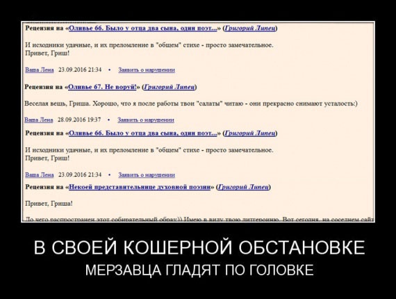 чтоб удалить его страницу, настрочив жалобу, а потом на своей странице пародировать его стихи и рассказывать своим мухоморам и бледным поганкам про то — какой Виталий антисемит.