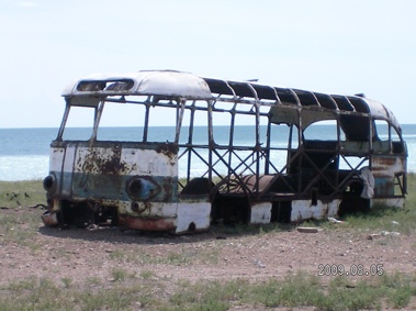 Фо. Казахстан. Балхаш. Сгоревший автобус. Маяк дяденьки, где можно отдохнуть без проблем. Несколько км от трассы по прерии.
